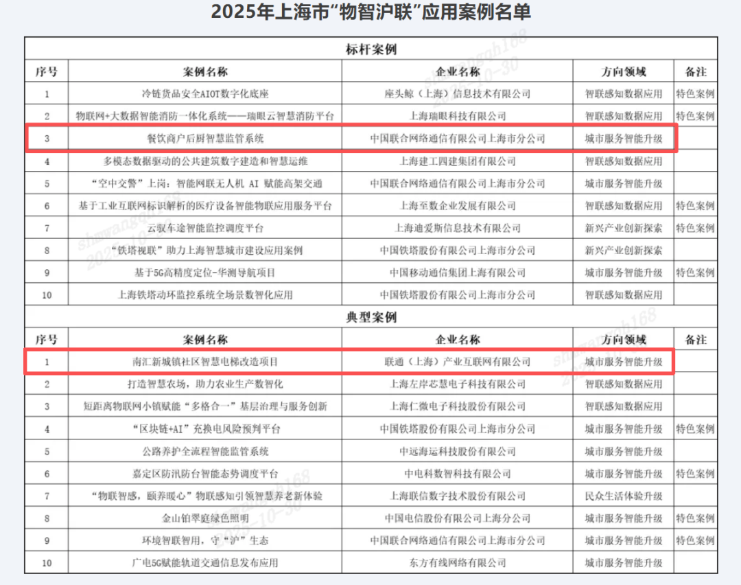近日,2025 年上海市物联网及物联感知 “物智沪联” 应用案例评选结果重磅揭晓!联通(上海)产业互联网有限公司(以下简称“产互公司”)参与支撑的 “餐饮商户后厨智慧监管系统”与“南汇新城镇社区智慧电梯改造项目”,凭借技术创新、场景落地及显著社会价值等突出表现,成功斩获“标杆案例”和“典型案例”殊荣,成为城市服务智能升级领域的典范之作。