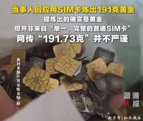 他表示,提炼出的确实是黄金,但并非来自“单一、完整的普通SIM卡”,而是来源于通信电子领域中的芯片类镀金废料集合。网络上流传“191.73 克”这一数字,是某一批次成品的称重数据,但在传播过程中被简化成了“用 SIM卡炼金”,这一说法并不严谨,也容易引发误解。